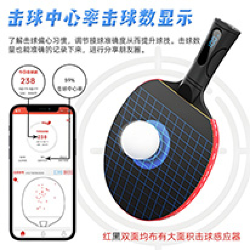 产品卖点:独创的碳纤维复合底板或木质复合板可选的二代智能乒乓球拍,实现了轻量化,横拍重量在185克左右,实用新型专利的组合结构设计,同时实现了高弹性,超轻及声音清脆多项特性,碳纤维复合底板与传统拍比更加优良,胶皮标配四星胶套,定制可出不带胶皮的选项,自行个性化使用胶套.,功能方面也是国内仅有本司生产的第二款可量产的智能乒乓球拍,主打训练与教培市场
